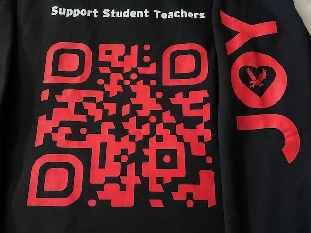 The backs of the shirts displayed an ask to “Support Student Teachers” and a large QR code directing people to a donation site for the college’s Teachers for Teachers Fund.