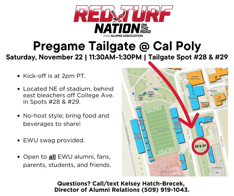 In partnership with EWU Athletics and the Eagle Athletic Fund, the EWU Alumni Association proudly presents Red Turf Nation on the Road! This exciting engagement opportunity exemplifies the unwavering dedication of EWU alumni, fans, students, families, and supporters. Through dynamic events across the region and beyond, Red Turf Nation on the Road fosters community, celebrates school spirit, and creates meaningful opportunities to rally behind EWU Football—wherever the Eagles take the field.