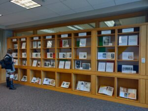Student looks at the Women of the Bauhaus exhibit in the JFK Library.