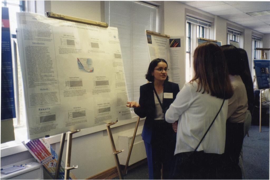 Nurturing Talent: Created to honor Ronald E. McNair, the heroic astronaut and physicist who perished in the 1986 Challenger disaster, for the past 30 years EWU’s federally funded TRIO/McNair Post-baccalaureate Achievement Program has helped dozens of talented first-generation, low-income and otherwise underrepresented undergraduates prepare for graduate programs that lead to careers as professors and professional researchers. This image, made in the early 2000s, shows McNair Scholar Yolanda Valencia ’02 during a student research presentation. Valencia, now a professor at the University of Maryland, Baltimore County, completed her doctorate at the University of Washington.