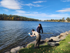 EWU geosciences students Basil Lund [left] and Cadence Meier-Grolman collect lake water samples near Spokane County’s West Plains. Photo by Chad Pritchard.