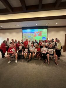 A group of Eastern alumni, faculty and friends, including EWU President Shari McMahan (bottom row, center), share their magazines — and EWU pride — at this winter’s ‘Eags in the Desert’ event in Arizona.