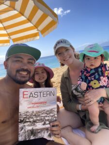 Andrew ’15 and Kristen Landeza ’15, with their daughters, Kaisley, 5, and Koah, 7, display their Eastern magazine, and Eagle pride, while sharing a perfect, sunshiny day on the beach in Maui.