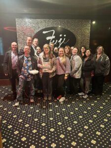 Kristy Garrett ’80, is surrounded by the doctors, practice manager, dental assistants and hygienists that she worked with for 22 years at the Willamette Dental Group in Idaho Falls. Garrett brought her magazine with her to her retirement celebration. “While I did not travel to a far away land with my Eastern magazine,” she wrote, “I am proud to be an alumni of EWU, and grateful for the support I have received from my coworkers.”