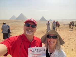 Intrepid Eagle Mitch Swenson ’82 and his wife, Kris, braved temperatures as high as 110 degrees while visiting the pyramid complex at Giza. The couple traveled to Egypt to see the sights and to visit family in Alexandria.