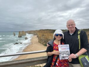 While on a three-week visit to Australia, Gary Wilson ’75, and his wife, Pimei, brought their magazine to a viewpoint near the Twelve Apostles, a series of limestone stacks off the coastal boundary of Port Campbell National Park.