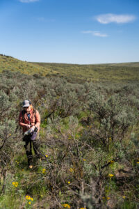 “It was dry and hot, for sure,” Eddy says with a laugh. “A lot of fighting through the sagebrush, trying not to destroy habitat, to be gentle as possible as I was going along. It can get monotonous, because you’ve got to look as closely as possible to spot potential burrows under each bush. But you kind of get a sense for it as you’re out there, and eventually you start seeing where those burrows are.”