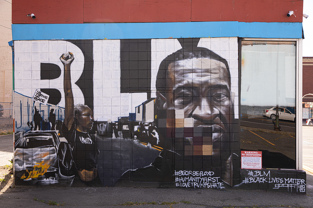Daniel Lopez’s mural dedicated to George Floyd — and the protestors seeking justice following his killing — on the side of a downtown business in Spokane. Photo by Chris Thompson.