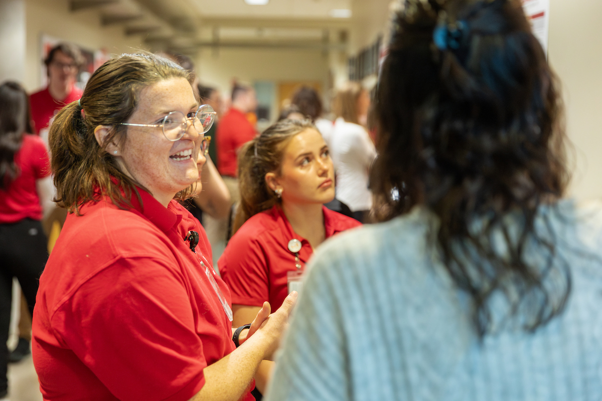 Youngs took his time meeting students, looking at their presentation posters and hearing about their research areas, such as assessing the impact of music and dance on dementia patients.
